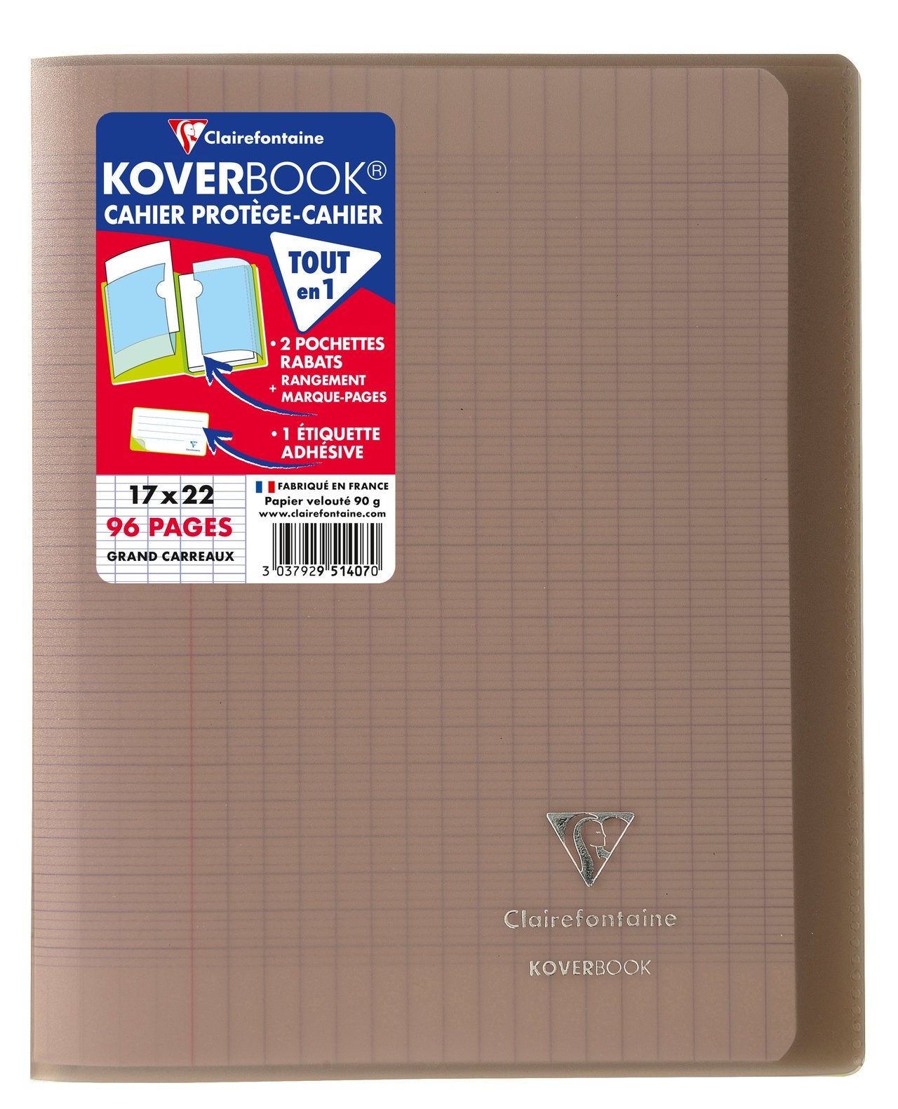 Cahier piqué Clairefontaine Koverbook 17x22cm 96 pages grands carreaux couverture polypropylène transparent Gris. Koverbook l'original : cahier & protège-cahier, tout-en-un ! Couverture solide et protectrice en polypropylène transparent avec deux grands rabats à pochette pour marquer les pages et ranger les documents utiles ! Fourni avec une étiquette adhésive pour personnaliser le cahier (nom, prénom, matière, classe...). Papier Clairefontaine Vélin Velouté 90 g, pour une sensation de glisse unique. Fabriqué en France.