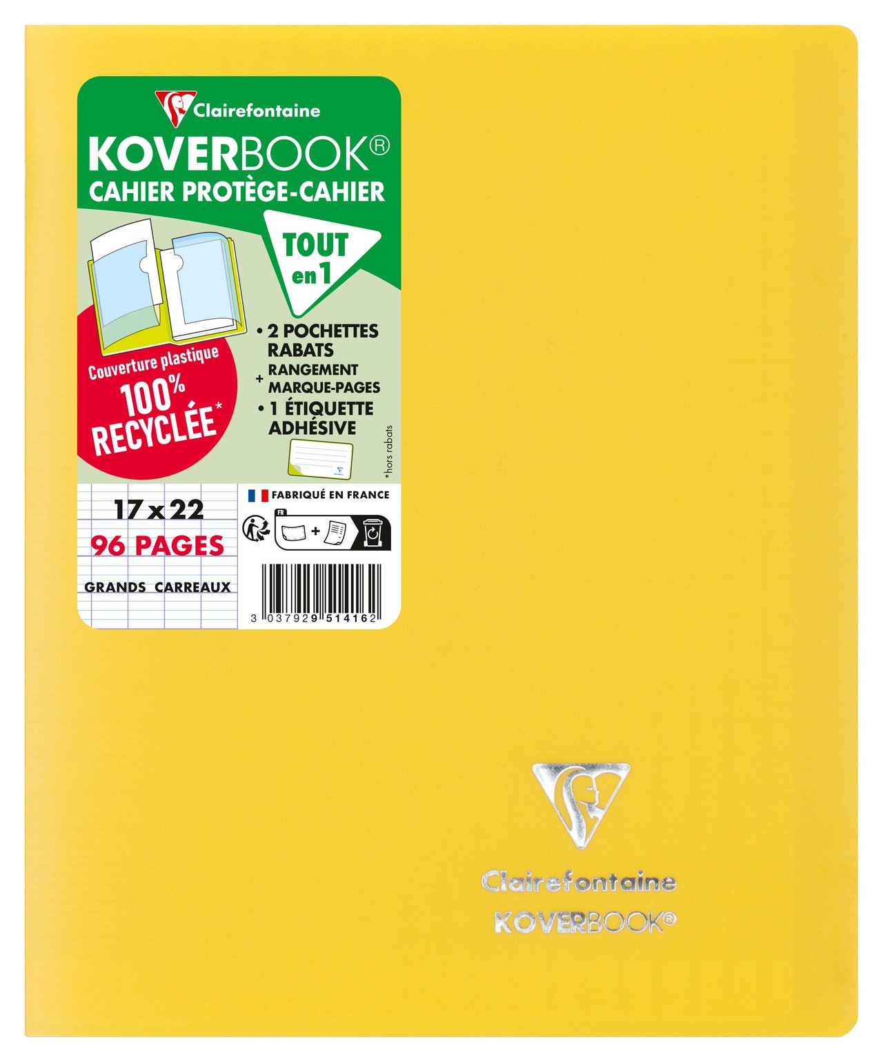 Cahier piqué Koverbook 17 x 22 cm 96 pages grands carreauxJauneCahier protège-cahier, tout en 1 !Couverture solide et protectrice en polypropylène opaque 100% recyclé avec deux grands rabats à pochette pour marquer les pages et ranger les documents utiles !Fourni avec 1 étiquette adhésive pour personnaliser le cahier (nom, prénom, matière, classe...)Réglure Clairefontaine Seyès tricolore pour un meilleur confort d'écriture !Marge en rouge, lignes d'écriture en violet et interlignes en bleuPapier Clairefontaine Vélin Velouté 90 g, pour une sensation de glisse uniqueFabriqué en France