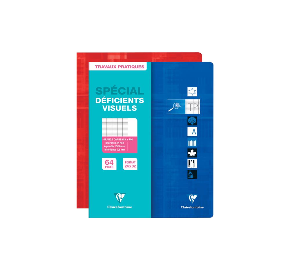 Cahier Travaux Pratiques piqué déficients visuels Clairefontaine 24x32 cm 64 pages grands carreaux noirs 2,5 mm agrandis 10x10 + uni Couleur aléatoire. Lignage spécial déficients visuels : carreaux agrandis, imprimés en noir avec les lignes primaires et la marge plus marquées que les lignes secondaires. Couverture carte pelliculée brillante et imperméable. Papiers Clairefontaine : Vélin Velouté 90 g et Dessin extra blanc 125 g. Certifié PEFC, pour la gestion durable des forêts. Fabriqué en France.